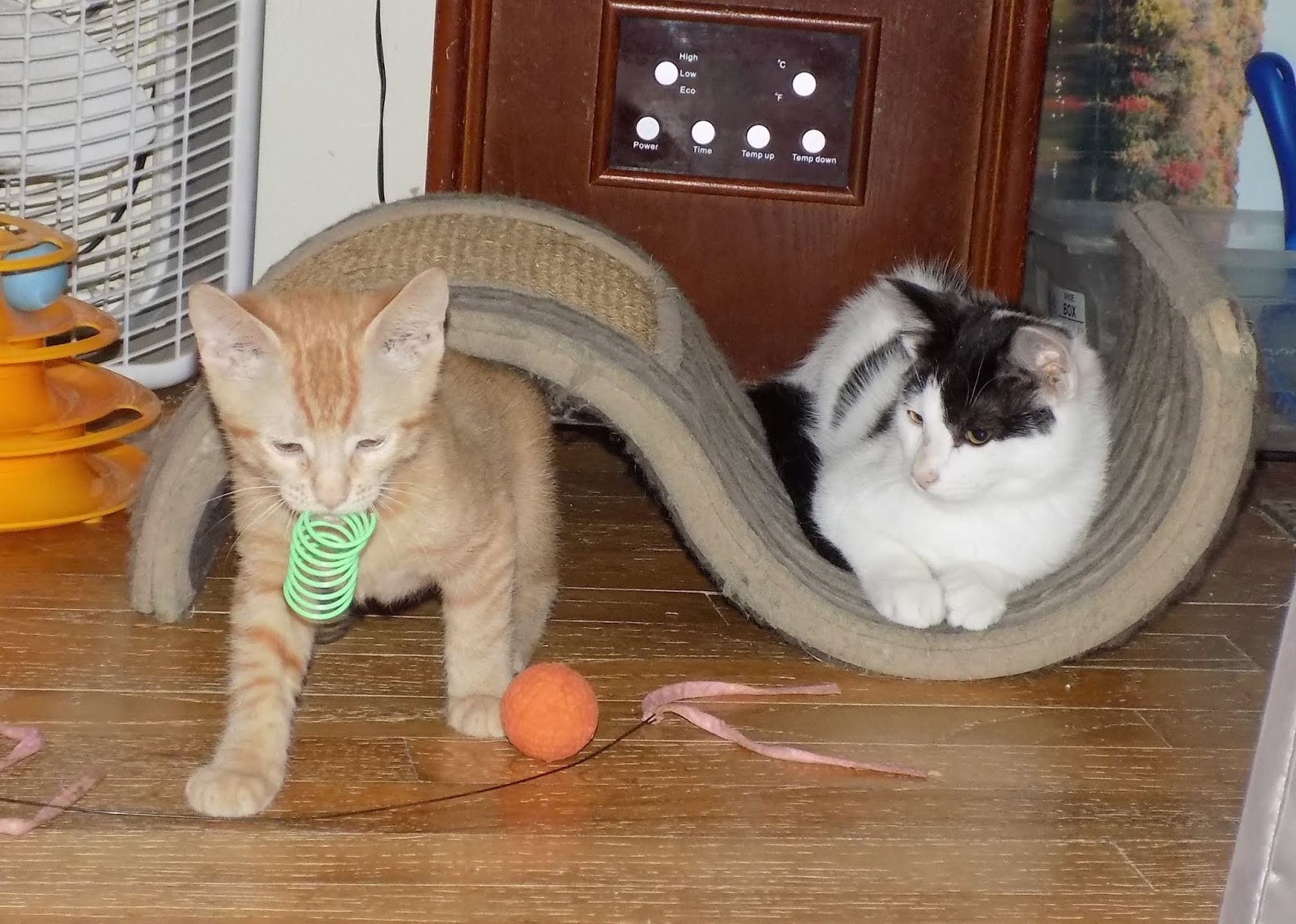 The only glitch so far is that Good Boy is so eager to hang out with the other cats, and he's so big and, well, clumsy, that he tends to galumph toward them at full speed, and they get scared and vamoose.